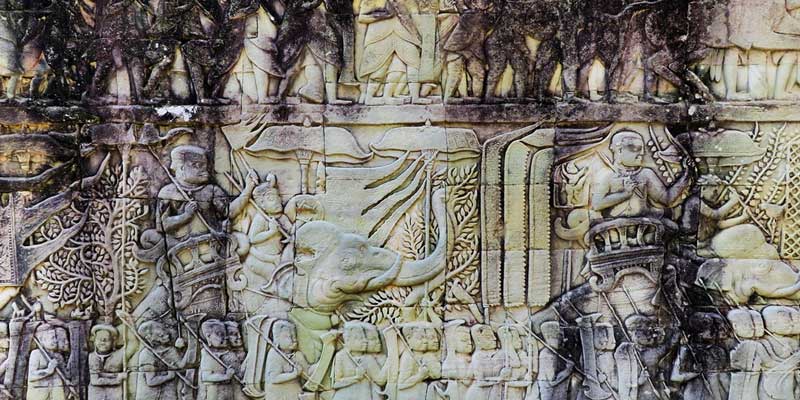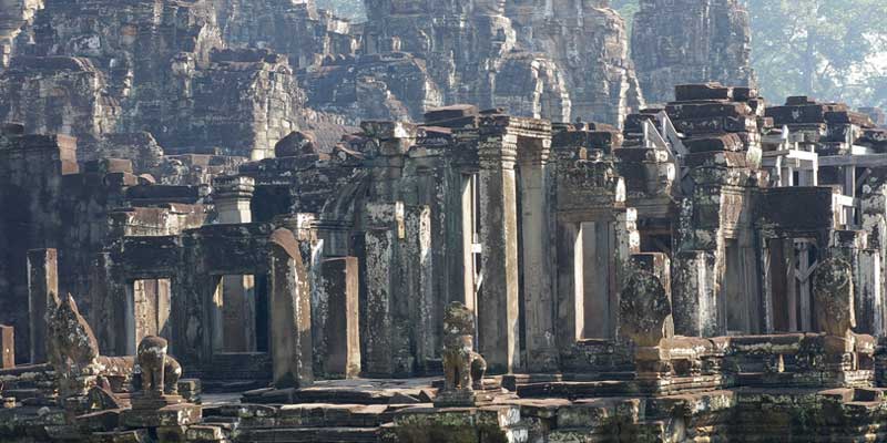 Morning, visit the South Gate of Angkor Thom: the Bayon, Bapoun, Baksei Chamkrong, the Elephant Terrace and the Terrace of the Leper King.